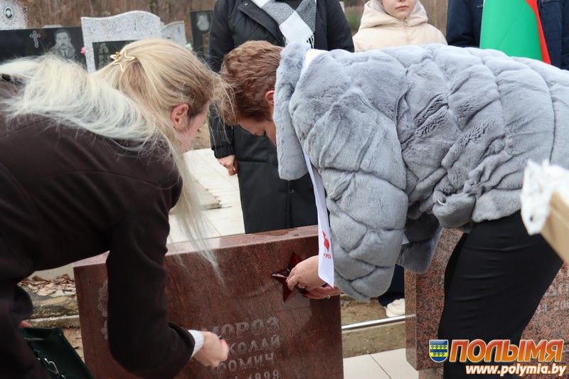 19 ноября возле захоронения ветерана Великой Отечественной войны, бывшего заведующего отдела народного образования Кореличского района Николая Фомича Мороза собрались начальник отдела образования Кореличского райисполкома Ирина Осташевич, заместитель председателя Кореличской РО РОО «Белая Русь» Ольга Ивашко, педагоги и учащиеся средней школы № 1 г.п. Кореличи, настоятель храма святых апостолов Петра и Павла г.п. Кореличи иерей Игорь Пирог и внучка Николая Фомича, Юлия Кондратьева, чтобы установить на памятник пятиконечную красную звезду.