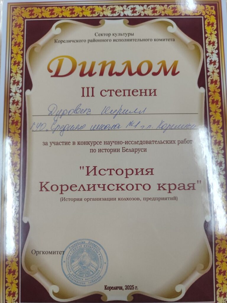 19 декабря 2025 года состоялся районный конкурс научно-исследовательских работ «История Кореличского края», где работа «КСУП «Племзавод Кореличи» : в одной «упряжке» с историей» учащегося 8 «А» класса Дуровича Кирилла (руководитель Наумчик Т.А.) отмечена дипломом 3 степени.