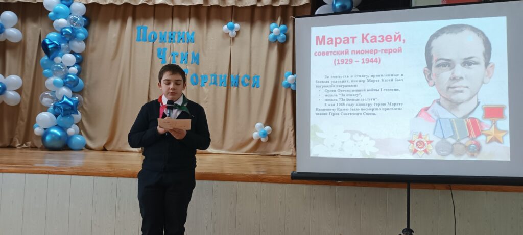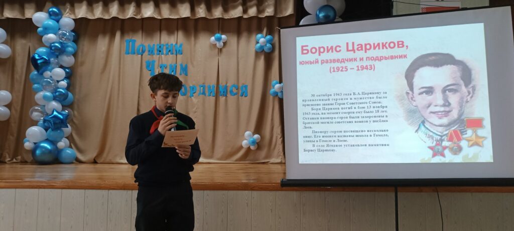13 февраля 2026 года в рамках месячника патриотического воспитания «Мужество. Подвиг. Слава» состоялся Сбор пионерской дружины имени Николая Артюха «Помним. Чтим. Гордимся».Пионеры-активисты рассказали о своих ровесниках – мальчишках и девчонках, чье детство оборвала война, вспомнили земляков, исполнявших воинский долг за пределами Отечества.Две войны. Две трагедии. Но одна боль и одна память. Наш долг – хранить ее и передавать дальше. Навигация по записям Учащиеся 9-11 классов посетили выставку «Образование и карьера» Воспитанники ВПК «Правнуки Победы» приняли участие митинге-реквиеме «Память сердца» ко Дню памяти воинов-интернационалистов